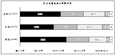 | 民生児童委員の全体経験平均年数は6.79年。男性が6.03年、女性が7.71年と女性の平均年数の方が長い。男性は経験年数5年未満が半数を占めている。 |