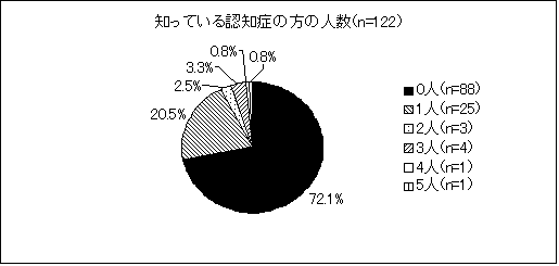 | 本調査では、民生児童委員に担当地区で認知症のある方を何人知っているか尋ねている。民生児童委員の知っている認知症の方の数は、平均0.4人であった。1人も知らないと答えた割合が最も多く、全体の72%を占めていた。1人知っていると答えたのは21%、2人が3%、3人が3%、4人が1%、最も多く答えたのは5人で全体の1%であった。 |