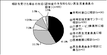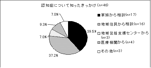 | 民生児童委員が知っている、認知症の43事例のなかで、認知症であると知ったきっかけは、家族から相談が最も多く40%、継いで地域住民から相談が37%とこの2つで四分の三を占め、地域包括支援センターや医療機関といった専門機関からは少なかった。 |