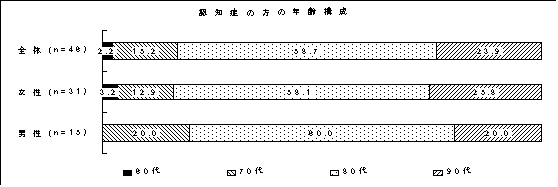 | 認知症の方の年齢は、全体平均が85歳、男性85歳、女性84歳で差はほとんど無く、男女とも80代がほぼ6割、2割が90代を占めており、高齢において症状がみられている。 |
