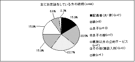 | 主にお世話している続柄は、息子23%、息子の嫁が16%、娘21%と、全体の60%は子ども世代がお世話をしており、配偶者16%、妹2%も含めると8割近くは親族がお世話をしている。現在施設入所している方も7%あるが、親族以外の公的サポートが主にお世話をしているのは、15%であった。 |
