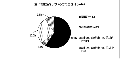 | 主にお世話をしている方の居住地は、同居が6割を占めていた。自転車で30分以内のものも、3割弱を占め、自転車・自動車で30分以上かかる遠距離に居住している割合は約1割で、全体としては、近距離に居住していた。 |