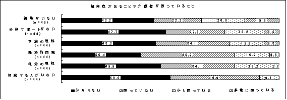| 本調査では、認知症があることで困っていることとして「分からない」「困っていない」「少し困っている」「非常に困っている」の4段階で下記のことにつて質問している。「非常に困っている」割合が高いものから、「親族でみる人がいない」が約16%と最も高く、「公的サポートがうけられない」と「認知症に対する家族の理解がない」が約7%、「経済的な問題がある」が約5%、「認知症に対する社会の理解がない」が約2%、「相談する人がいない」0%の順であった。「非常に困っている」と「少し困っている」の合計と、「困っていない」の差に注目すると、「親族がいない」のみが「非常に困っている」「少し困っている」のポイントが高く、親族の要因の重要性がみてとめる。 |