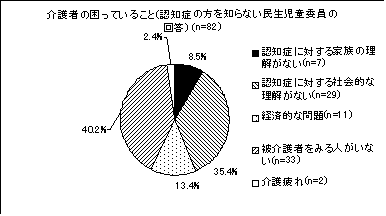 | 2-2-6aは複数回答であり、本設問は択一のため、正確な比較はできないが、認知症の方をしらない民生児童委員の方に、認知症があることで介護者はどのようなことに困っているかと尋ねたのが、本設問である。ほぼ同様の結果であり、最もたかいものが、「被介護者をみる人がいない」の40%、次いで、「認知症に対する社会的な理解がない」の35%、「経済的な問題」の13%、「認知症に対する家族の理解がない」の9%であった。 |