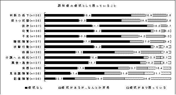 | 「症状があり困っている」割合が最も高かったのは、「記憶障害」の約37%であるが、こは「症状があるが、なんとか対処」も約49%と同程度の割合を占め、8割弱の対象者に症状が見られている。次いで、見当障害の21%であり、症状があるがなんとか対処も32%を占め、約5割に症状が見られている。3番目は、妄想の18%であるが、症状があるが何とか対処の割合は24%と前者の2つに比べると低く、全体の4割強に妄想の症状が見られている。これら3つ以外で、症状があり困っていると回答した割合は、10%以下となっていた。徘徊、不安、抑うつ状態は、「症状があり困っている」との回答は10%以下であるが、「症状があるが、なんとか対処」の割合が30%以上あり、全体の4割程度に症状が見られる。 |