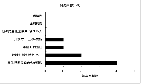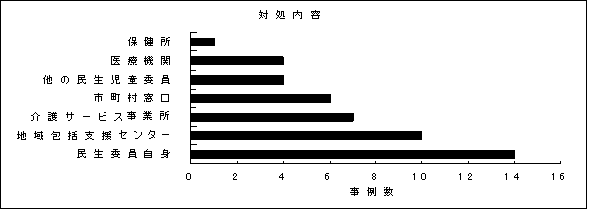 | 実際に対処した内容は以下のような結果であった。「民生委員自身が相談にのった」が最も多く14ケース、次いで「地域包括支援センターに相談」が10ケース、「介護サービス事業所(施設・ケアマネージャーを含む)」が7ケース、「市町村窓口(高齢障害福祉課・介護保険課等)」が6ケース、「他の民生児童委員などに相談」・「医療機関に相談」が4ケース、「保健所」が1ケースであった。 |