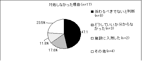 | 対処しなかった理由として、「関わるべきでないと判断した」が8ケースと最も多く、「どうしていいか分からなかった」3ケース、「施設に入所した」が2ケースであった。質問票では「関わろうと思ったが、家族などに拒否された」という選択肢を儲けていたが、該当するケースはなかった。 |