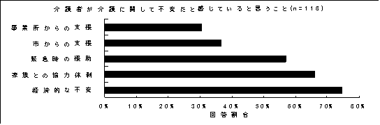 | 民生児童委員が、介護者が介護に対して不安に思っていることについて回答したのが下図である。最も高かったのが「経済的な不安」で全体の75%が不安と回答、次いで、「介護に関して家族と協力体制がとれるかどうか」の66%、「緊急時に援助が受けられるかどうか」が57%、「市から十分な援助が受けられるかどうか」は36%、事業所から十分な援助をうけあれるかどうか」は31%であった。 |