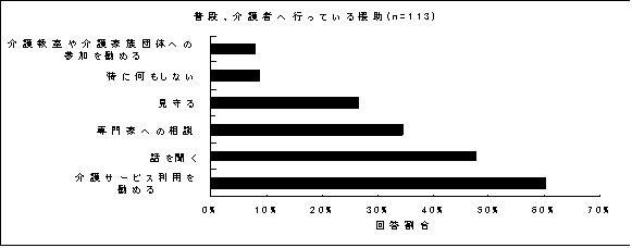 | 民生児童委員が普段、介護者へ行っている援助について尋ねたのが下図である。最も多かったので、「介護者の介護負担が減るような介護サービスの利用を勧めている」で、約6割が行っていた。次いで、「介護者の話を十分にきいている」が約5割、「専門家への背負う談を勧める」が3割強、「見守る事」が2割強。「特に何もしない」「介護教室や介護家族団体への参加を勧める」は1割弱であった。 |