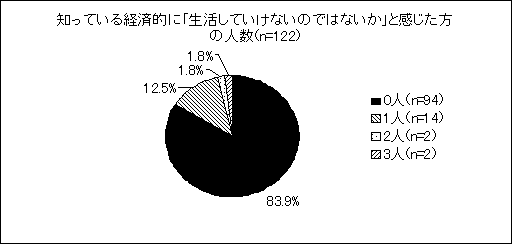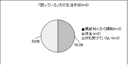 | 「困っている」と回答した6名の生活手段は、年金などをもらい生活している方が半分、公的な援助も何も受けていないように思えるケースが半分ずつであった。 |