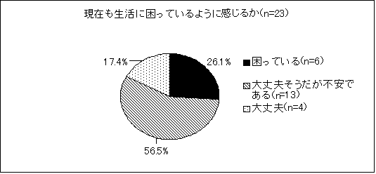 | 本調査では、経済的に生活していけないのでは感じた方それぞれについて、民生児童委員の方がどのように感じているのかを質問している。経済的に生活していけないと感じた方23名の中で「現在でも生活に困っている」のは26%、「大丈夫そうだが不安である」が57%、大丈夫が17%と、四分の三の方に不安を感じている。 |