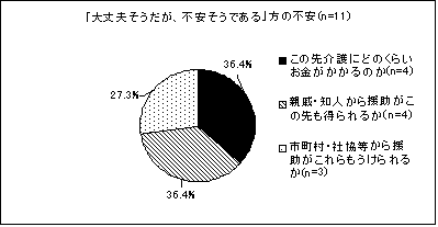 | 「大丈夫そうだが、不安そうである」と感じた方11名の不安の内容は、「この先介護にどのくらいお金がかかるのか」と「親戚・知人から援助がこの先も得られるのか」と回答したのが約4割ずつ、「市町村・社協等から援助がこれからも受けられるのか」と回答したのが約3割であった。 |