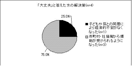 | 「大丈夫」と答えた方の4名の解決策は、「子どもや孫との同居により経済的な負担が無くなったが」25%、「市町村・社協等から援助が受けられるようになった」が75%を占めていた。選択肢には「親戚・知人から十分な援助が得られるようになった」というものも用意していたが、回答数は0であった。全体のケース数が少ないが、親族ネットワークよりは、公的な支援により解決している様子がみてとれる。 |