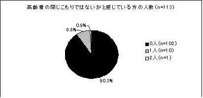 | 高齢者の閉じこもりについて知っているケースを尋ねている。全体の90%は1人も知らず、全体の9%の方が1名閉じこもりではないかと感感じるケースを知っており、1%が2名知っている。 |