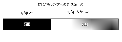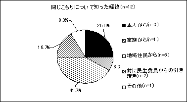 | 閉じこもりと感じられる12ケースのうち、民生児童委員が対処したのは全体の42%(5ケース)であった。 |
