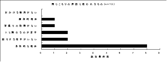 | 閉じこもりの原因についてあてはまるものの回答結果が上図である。最も多かったのが、身体的な理由で、12事例中8事例で理由とされていた。次いで、「話をする相手がいない」「人と関わるのが苦手」が2事例ずつ、「精神的理由」「家庭での役割がない」が1事例にあてはまった。「出かける場所がない」との回答は無かった。 |