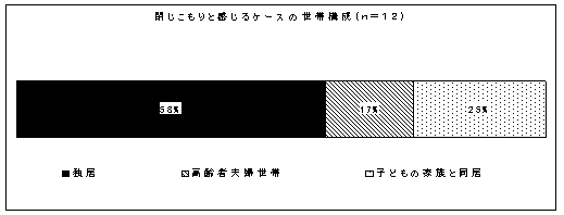 | 閉じこもりと感じる12ケースの世帯構成は、「独居」が最も多く58%を占め、次いで「子どもの家族と同居」が25%、「高齢者夫婦世帯」が17%であった。 |