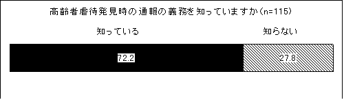| 高齢者虐待防止法・擁護者支援法第21条7項目には、高齢者虐待を発見した人は通報をする義務が定められている。この通報の義務を知っているのかを尋ねたところ、約7割の回答者は知っていた。 |