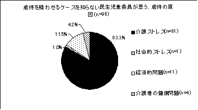 | 虐待を疑わせるケースを知らない民生児童委員が思う虐待の原因において、最も多かったのが、全体の83%を占めた介護ストレスであった。ついで、経済的問題の12%、介護者の健康問題の4%、社会的ストレスと1%という結果であった。 |