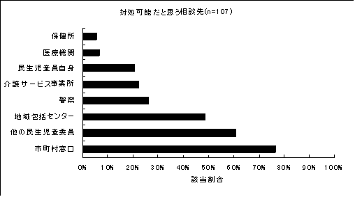 | 虐待を疑わせるケースを知らない民生児童委員に対して、もし虐待を発見した場合、どこに相談できるかを尋ねている。最も割合が高かったのは、市町村窓口で全体の77%が相談すると答えており、次いで、他の民生児童委員への相談を61%、地域包括センター49%、警察26%、介護サービス事業所22%、民生児童委員自身21%、医療機関7%、保健所6%という結果になった。本調査では、実際に虐待に関わった民生児童委員が2ケースしかないので、現実と比較することは出来ないが、現在の民生児童委員においては、市町村窓口および、同じ職務を行っている他の民生児童委員への信頼が高いことが伺われる。 |