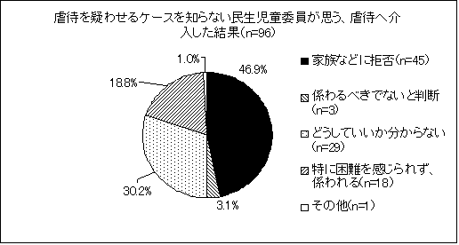 | 虐待を疑わせるケースを知らない民生児童委員に対して、仮に、あなたが、虐待の事例に介入した場合、どのようになるのかと思うのかと尋ねている。約5割が、家族などに拒否されると考えている。次い、約3割が、どうしていいのか分からないと答え、残りの約2割は特に困難を感じられず、係われると回答している。 |