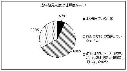 | 成年後見制度を知っていると回答した76名の中で、成年後見制度をよく知っていると答えたのは6.6%にすぎず、全体の61%がおおまかには理解していると回答し、33%が名称は聞いたことがあるが、内容まであまり理解していないと答えている。 |