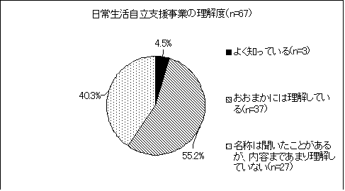 | 日常生活自立支援事業を知っていると回答した民生児童委員のなかで、日常生活自立支援事業を「よく知っている」と回答したのは全体の5%、「おおまかには理解している」は55%、「名称は聞いたことがあるが、内容まであまり理解していない」ひゃ40%であった。 |