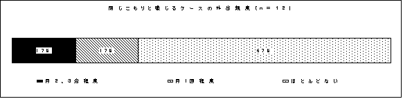 | 閉じこもりと感じる12ケースの外出頻度は、全体の67%は外出がほとんど無かった。外出をする者のうち、月1回程度が17%、月2、3回程度が17%と同数であった。 |